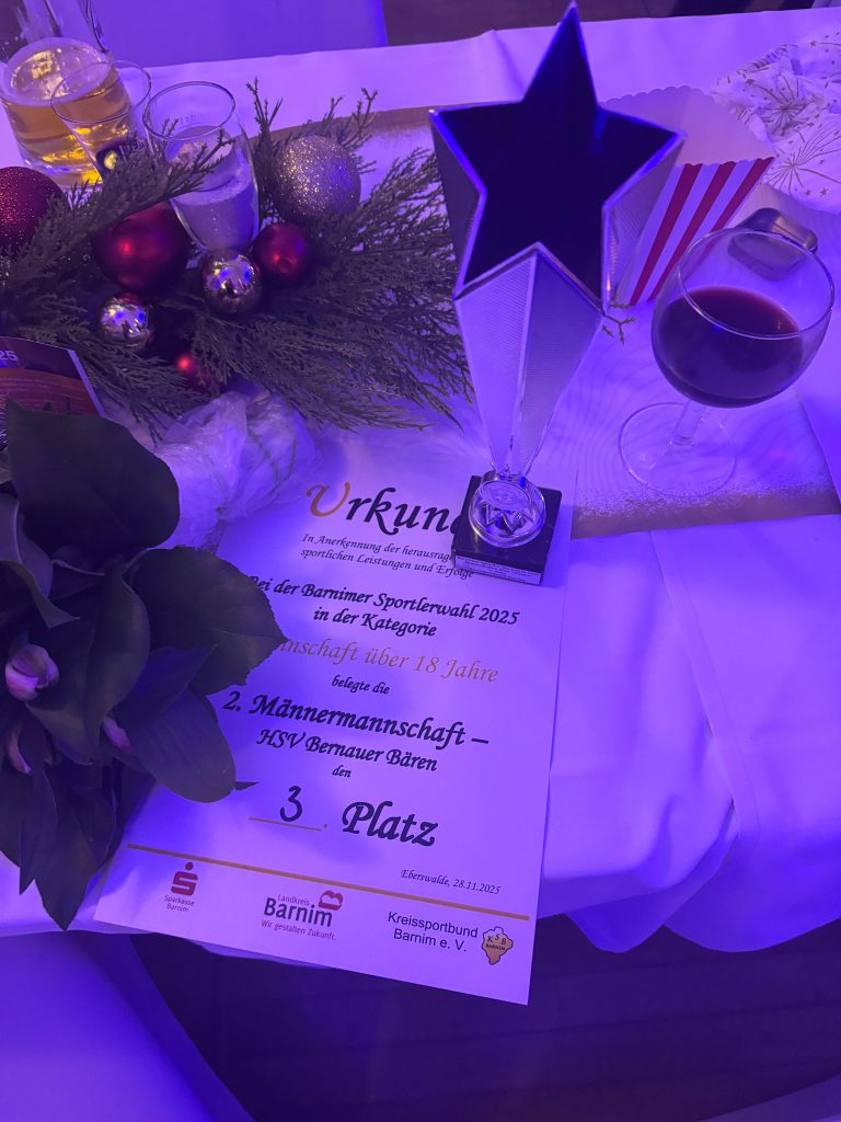 Große Anerkennung für die zweite Männermannschaft des HSV Bernauer Bären: Bei der 18. Barnimer Sportgala wurde das Team für seine herausragende Saison 2024/25 ausgezeichnet und belegte in der Kategorie „Mannschaften über 18 Jahre“ den 3. Platz. Damit setzten sich die Bernauer in der offenen Wahl unter anderem gegen den Oberligisten 1. SV Eberswalde durch. Ein Erfolg, der den sportlichen Aufschwung der vergangenen Jahre eindrucksvoll unterstreicht.